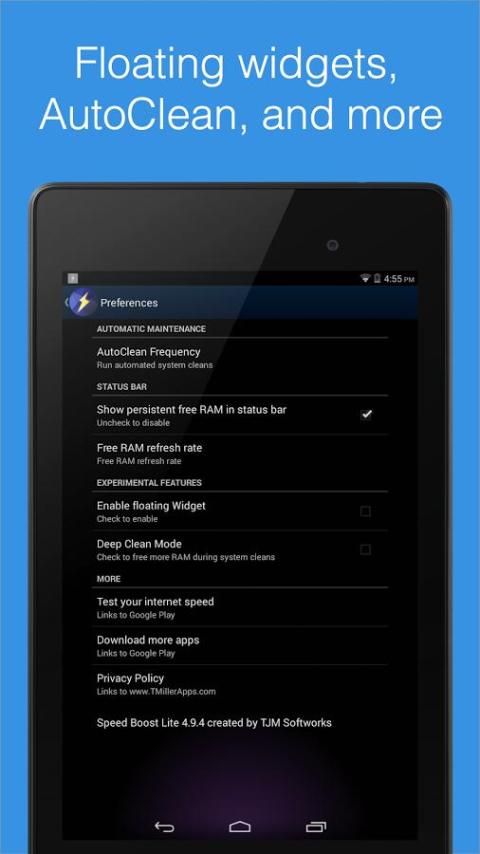 Магия скорость RAM Booster гений действительно Ram Booster для Android среди лучших мобильный телефон усилитель, ОЗУ тестер & скорость чистого через передовые системы ухода за свободный вариант. Кроме того вы можете узнать текущее состояние батареи и важную информацию включая: батарея информация: здоровье батареи: знать, если она находится в хорошем состоянии или перегревается. Это дает вам информацию о скорости руля на Интернет. Вы увидите вашего сигнала будет увеличиваться в простых boosting.1)* HTC Magic, Xperia X 10, REGZA телефона T - 01 C, LTE Галактика S2 Галактика NexusPermission: * не требуется разрешения Storage(WRITE_EXTERNAL_STORAGE) этот app не изменять/удалять содержимое SD карты. "чтобы настроить обои. #NAME? Статус ОЗУ: ОЗУ статус, он показывает интервал времени в секундах и sub меню как пауза, запись, около и выйти из справки, эта опция поможет пользователю и дать все инструкции. Проблемы с изображением шкафчик? НАС? 3 g - батареи заставка, вы можете легко управлять мобильных данных, WiFi и CPU скорость, вы можете сохранить потребление энергии под контролем (e.It из лучших инструментов saver(battery improve) батареи. Max Memory Booster освобождает и повышает вашу память устройства Android, убивая нежелательных приложений, очистка кэша и оптимизации использования памяти.