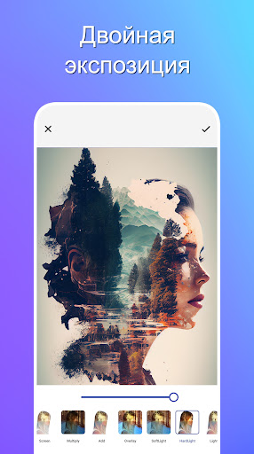 - С помощью инструмента двойной экспозиции вы можете создавать удивительные изображения, используя 2 фотографии, достигая профессиональных и веселых результатов.