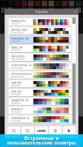 • Создавайте свои палитры, используйте встроенные или загружайте прямо с Lospec