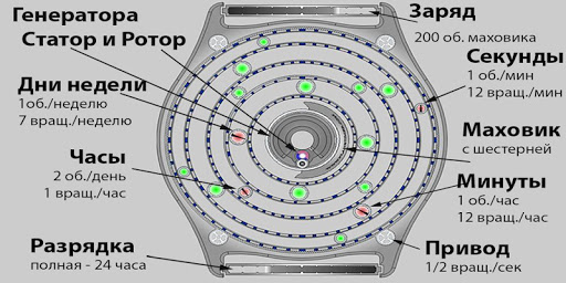 предполагающую маховик (инерционный сектор) для заряда батарей, вращается в соответствии с ориентацией вашего устройства (если оно поддерживает функцию гироскопа). Полный “заряд” наступает при 500 оборотах суммарно в любом направлении, после чего происходит холостое вращение инерционного сектора. Полного заряда достаточно для 24 часов хода, после чего часы останавливаются, до совершения 1 оборота сектора для запуска вновь.