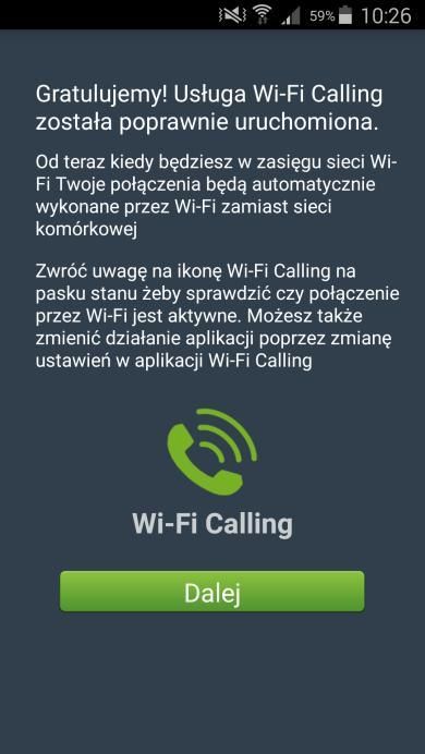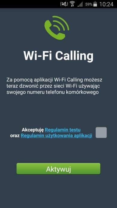Aplikacja WiFi Calling umożliwia realizowanie bezpłatnych połączeń głosowych z wykorzystaniem sieci Wi-Fi w ramach korzystania z usługi „Wi-Fi Calling-Test”. Warunkiem korzystania z usługi „Wi-Fi Calling-Test” jest pozytywna weryfikacja zgłoszenia potwierdzona wiadomością tekstową SMS. Szczegółowe warunki przystąpienia do testu i korzystania z usługi są zawarte w Regulaminie Testu Konsumenckiego Usługi Wi-Fi Calling-Test.