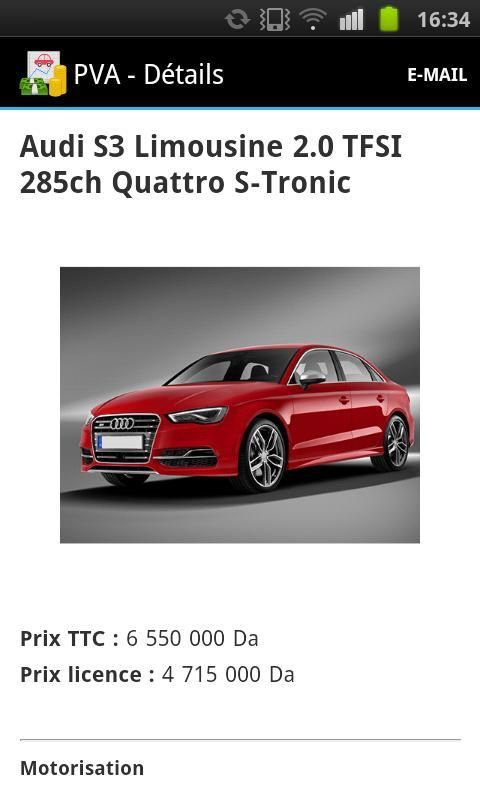 Алжир автомобилей Цена эксклюзивный мобильное приложение на Android, которая показывает новые цены автомобиля в Алжире. Вы можете проверить последние цены на новые автомобили от основных дилеров авто в Алжире, 52 автомобильных брендов среди них: Peugeot, Renault, Volkswagen, Toyota, Kia, Dacia, Chevrolet, Nissan, Mercedes, BMW, Seat ...... и т.д.