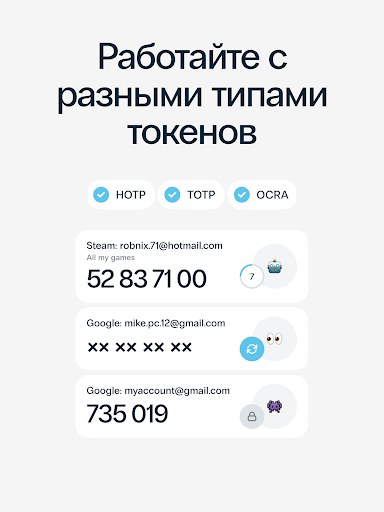 - Приложение для мультифакторной аутентификации Protectimus SMART OTP совместимо с большинством сайтов, поскольку поддерживает все алгоритмы генерации одноразовых паролей OATH, а именно HOTP, TOTP и OCRA.