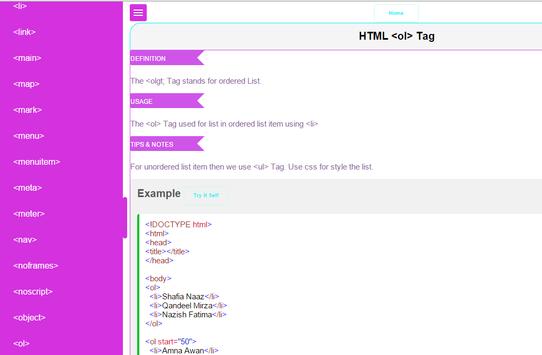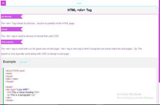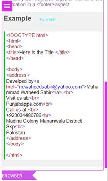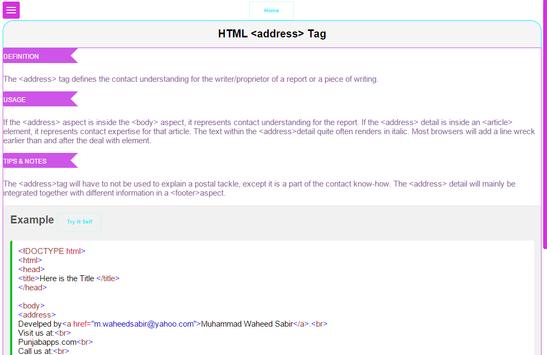 write the code and test the code within the app. All tags have Simple Example which are understandable. This app Make with simple English Language to learn quickly .Using Learn HTML can also learn the basic Css & also Learn Java Script using the Html editor which is working well which is completely beginner and advanced level html