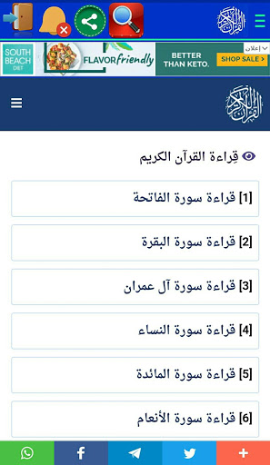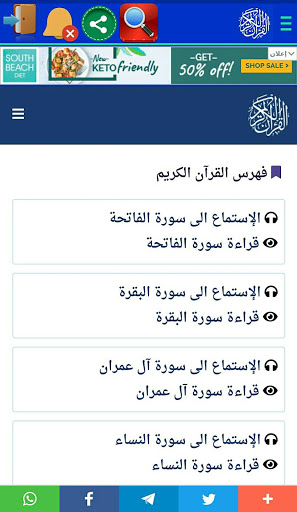 2- قسم لقراءة القرآن الكريم كامل والتفسير من خلال الضغط على الآية ليظهر التفسير كما يحتوي على معلومات حول السور كالتالي :