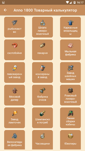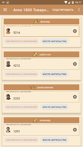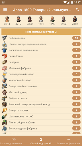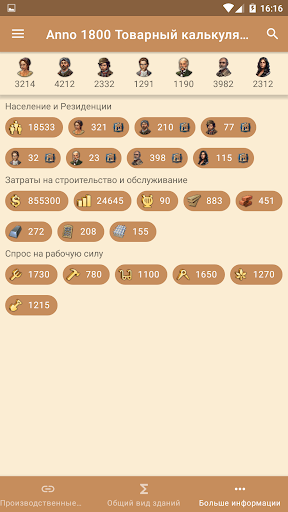 Товарный калькулятор Anno 1800 для Android рассчитывает количество необходимых производственных зданий в зависимости от численности населения острова. Это гарантирует оптимальное снабжение Ваших жителей.