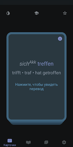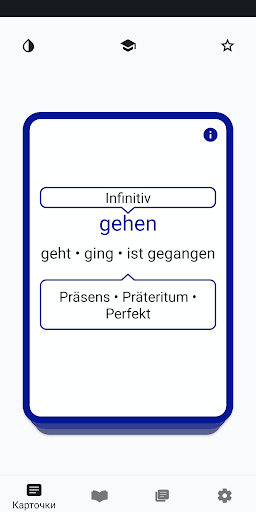 Мы выбрали самые полезные немецкие глаголы. Эти глаголы показываются на карточках, которыми можно управлять интуитивными жестами. Мы предлагаем различные наборы карточек, сгруппированные по уровню сложности и другим признакам.