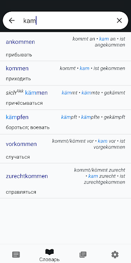 В режиме словаря вы можете искать глаголы при помощи универсальной строки. Мы поддерживаем поиск по неопределенной форме глагола (Infinitiv), по форме Präsens, по форме Perfekt (Partizip 2), по форме Präteritum, а также по переводу.