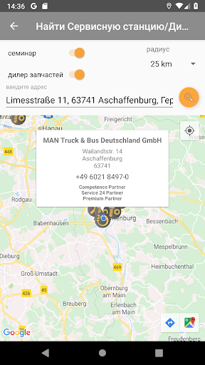 Быстрый поиск Сервисной станции или дилера запчастей, включая всю необходимую контактную информацию. Кроме того, вы можете напрямую связаться с Сервисной станцией или дилером запасных частей через отображаемые контактные данные или напрямую спланировать свой маршрут