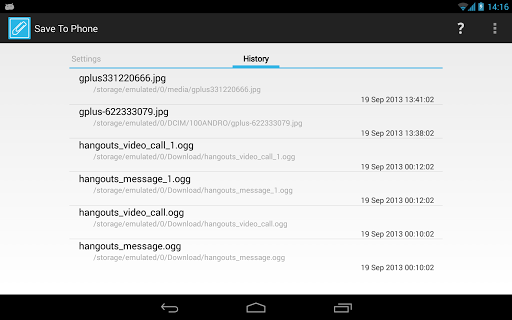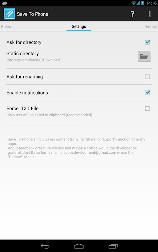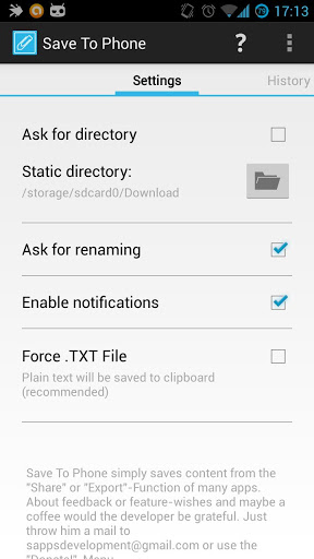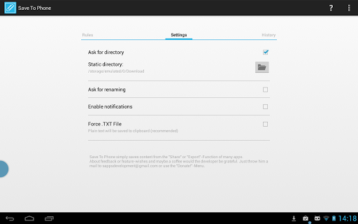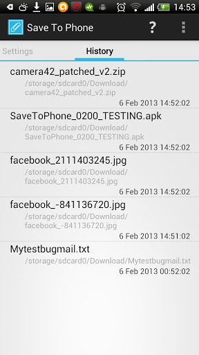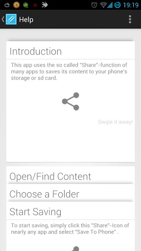 "Save To Phone" simply saves all content behind the "Share" or "Export"-Functions many apps have, to your external storage. May it be an SD-card, or an integrated storage - you choose the directory. Text can also be saved to your clipboard.
