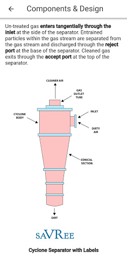 Это приложение научит вас о циклонных сепараторах (пыль коллекционерам)! Циклонные сепараторы используются во многих промышленных процессах, поэтому изучение немного о них имеет смысл, если вы работаете или присоединяетесь к любой инженерной промышленности. Но что такое циклонные сепараторы? Как они работают? Почему у них такая странная форма? Это приложение даст вам ответы на эти вопросы и многое другое!