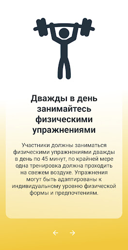 Ежедневное отслеживание упражнений: регистрируйте две 45-минутные тренировки в день, при этом хотя бы одна тренировка проводилась на открытом воздухе. Настройте тренировки в соответствии со своим уровнем физической подготовки и предпочтениями.