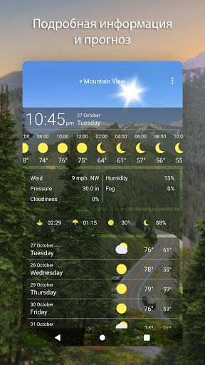 Движение солнца, осадки и фаза луны – реалистичная анимация на экране, с великолепно проработанными деталями. Живописный пейзаж отражает погоду с потрясающей точностью. Наслаждайтесь восходом солнца, радугой, пением птиц и каждым солнечным бликом!