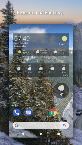 В реалистичном погодном приложении есть несколько типов виджетов: круглый виджет на 1 клетку показывающий температуру и вероятность осадков, виджет с погодой на 3 дня и часами, а так же виджет с погодой на 5 дней. Любой виджет можно сделать прозрачным или выбрать цвет фона в настройках при добавлении на рабочий стол.