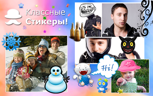 - Добавление стикеров. Огромный набор встроенных стикеров, сгруппированных по категориям, придаст фотографиям необычный вид и веселое настроение.