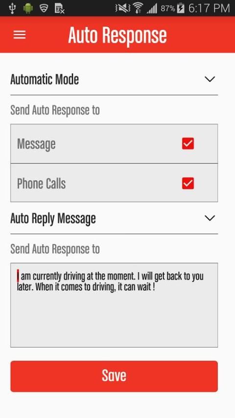 Авто-ответ на телефонные звонки, тексты, или оба! Сделайте свой автоматический ответ специальное сообщение, чтобы ваши близкие знать, что вы за рулем!