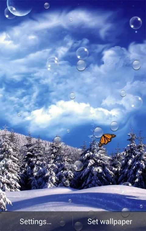 Winter Live Wallpaper красивая природа картина зимой обои с большим количеством дождевой капли на экране и некоторых бабочек, летящих через и много пузырьков.