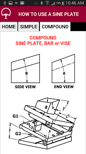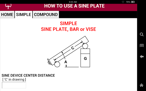 This app gives basic instructions on using a simple or compound sine plate. It also will calculate the required gage block stacks for almost any angle or center distance.