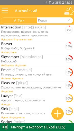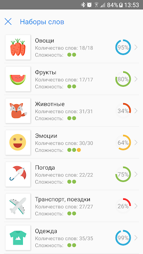 • Готовые наборы слов разных тематик (пока только для английского языка);