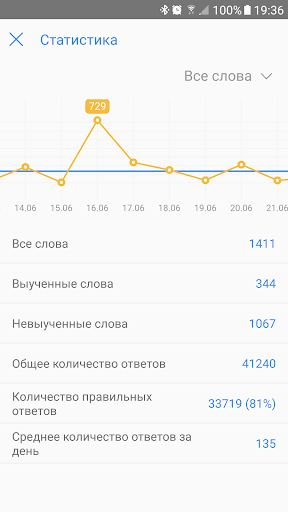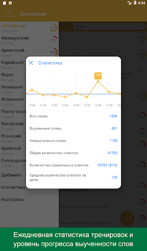 • Оценка усвоения слов со статистикой изучения английского и остальных языков;