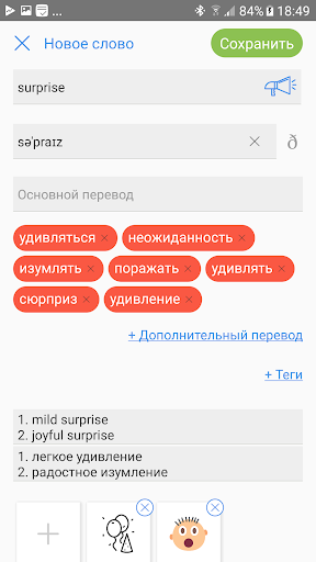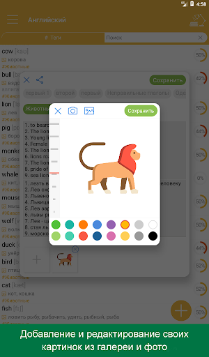 • Добавление фотографий к словам, добавление фотографий из галлереи, добавление картинок из других приложений (из браузера);