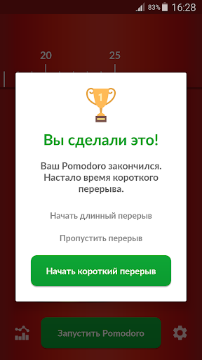 Один Pomodoro™ длится всего 25 минут, и вы должны избегать всех прерываний во время него. Да - ваши письма, телефонные звонки и любые другие дела могут подождать несколько минут. Частые перерывы позволяют мозгу сохранить свежесть и оставаться сосредоточенным. Это делает Pomodoro Technique® простым и эффективным способом быстрого выполнения задач.