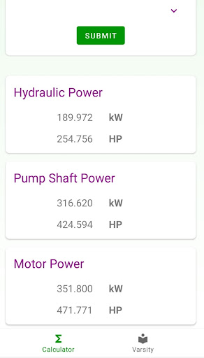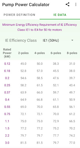Это приложение, давайте вы рассчитываете мощность двигателя вашего насоса.Вы можете играть вокруг различных параметров насоса Viz.Насосная головка, скорость потока, насос и повышение эффективности двигателя.Т.е. таблица эффективности была предоставлена для выбора подходящей эффективности двигателя.