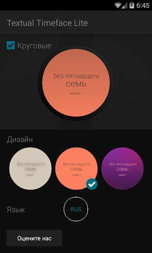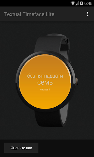 Вместо традиционных стрелок и часов, данный вариант оформления использует слова и предложения для обозначения времени. Взгляните на часы и вы увидите 'без пятнадцати семь', вместо привычного '6:45'.