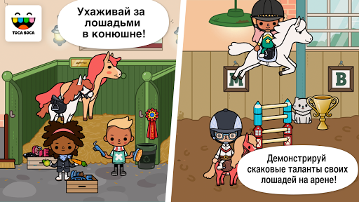 Добро пожаловать в мир конюшен и приключений! Ухаживай за лошадьми и участвуй в скачках! Вообрази себя средневековым рыцарем на турнире или ковбоем на Диком Западе. Катайся на мотоцикле и ночуй под открытым небом! Toca Life: Stable — играй, как тебе нравится!