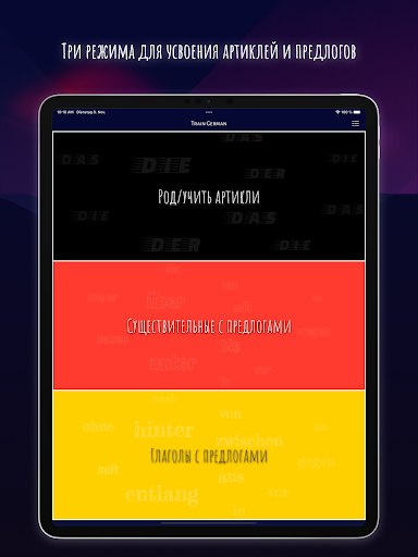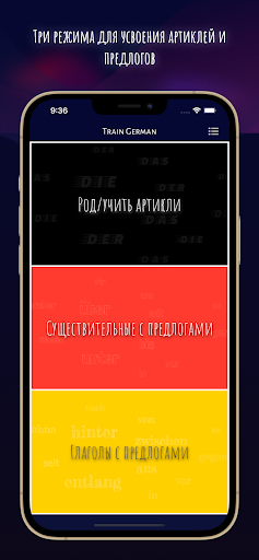 Train your German — это приложение для эффективного запоминания рода существительных и связи предлогов с глаголами/существительными. Это одни из основополагающих тем в изучении немецкого языка, без освоения которых правильно говорить не получится.