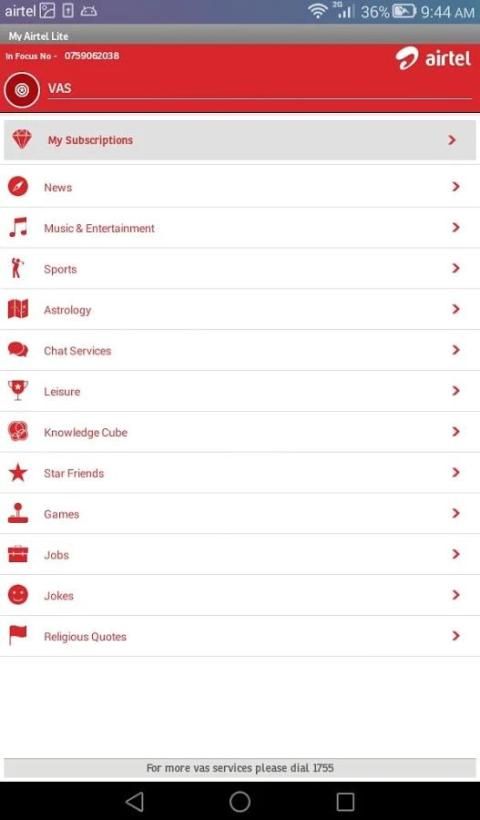 • Доступ к Airtel Информационные услуги, такие как магазин деталей, ставок IDD, тарифы на роуминг, ближайший Airtel Location, Airtel Sewa деталей центра