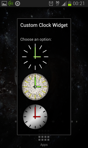 This is a simple clock widget with allows you to change the clock faces to view your time on an analogue clock. After installing the app, DO NOT access it it via the apps but rather go to the Widgets and drag to any of your home screens. Touch the clock to change the clock face. Tap on the clock face you desire to use