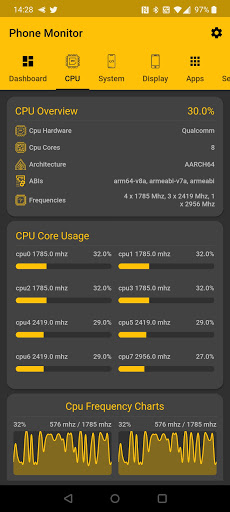 ★ процессор: e.g.Информация о процессоре, графиками процессора за серверу, утилизация CPU, архитектура и ABI (двоичный интерфейс Android), частоты процессора