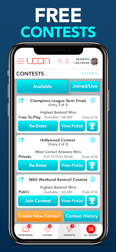 Нет необходимости кредитной карты.Получите 10 000 UDDA Bucks.Сведите друзей, чтобы заработать больше UDDA Bucks.>;Спорт в колледже, включая НФЛ, НБА, MLB, НХЛ, футбол в колледже, баскетбол NCAA, профессиональный футбол, MMA, UFC, гольф, теннис и многое другое!Вы также можете использовать шансы, чтобы сделать выборы непосредственно против ваших друзей.
