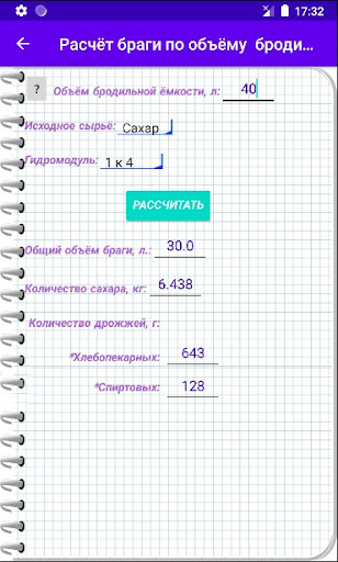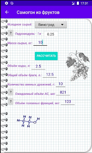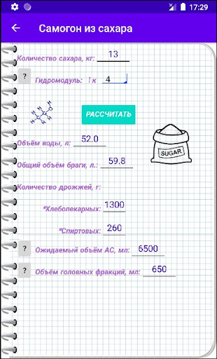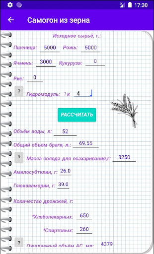 Приложение представляет собой калькулятор, с помощью которого можно рассчитать необходимое количество сырья, воды и дрожжей для изготовления самогона.