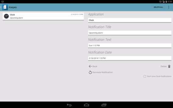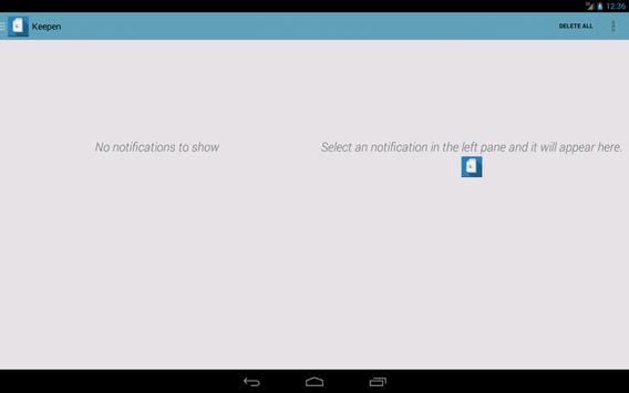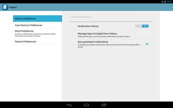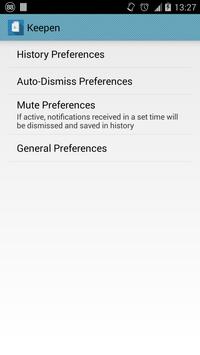 Keepen saves your notifications so you can see them later, even if you have dismissed them! Also, you can select apps in your device and when they send a notification, Keepen will automatically dismiss and save the notification in the "Dismissed Notifications" list!