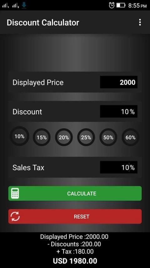 Невероятно простой и удобный скидки и продаж калькулятор. Очень удобный инструмент, чтобы иметь при покупке чего-либо.
