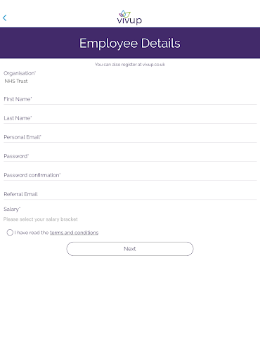 Вы можете зарегистрироваться непосредственно в приложении, но обратите внимание, что ваш поставщик льгот должен быть членом Vivup.Для получения дополнительной информации, пожалуйста, посетите https://www.vivupbenefits.co.uk