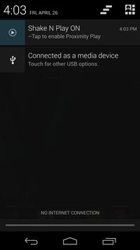 Usage : Tap on notification bar to switch between shake N Play and proximity play mode. Face down to pause and Face up to continue music.