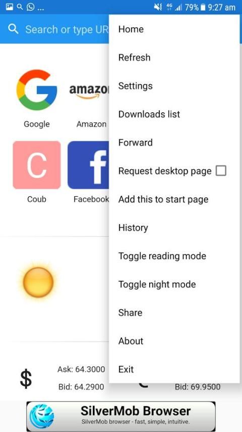 4G Браузер обеспечивает быструю скорость интернета на вашем устройстве Android. Вы можете контролировать все меню, как режим скорости загрузки тумблер ночь, чтение Tongle страницы обновления режима, настройки, список халявного, вперед, запрос рабочего стола страницу, добавить на главную страницу, историю, о и делиться.