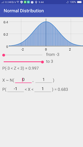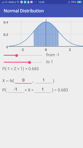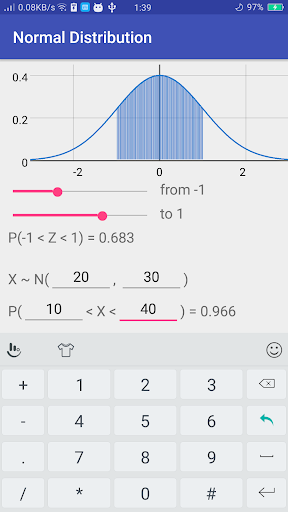 Это приложение рисует стандартное нормальное распределение и вычисляет совокупную вероятность между любыми двумя значениями на горизонтальной оси.