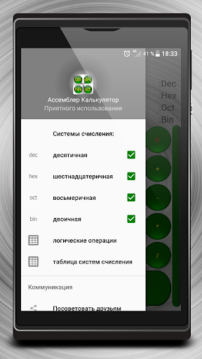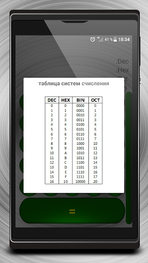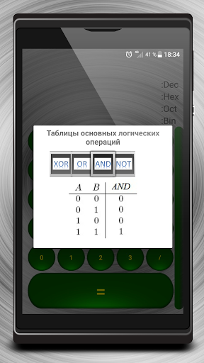Приложение предназначено для компьютерных вычисление, в котором можно складывать, вычитать, умножать, делить и выполнять логические операции (XOR, OR, AND и NO) с десятичными, шестнадцатеричными, восьмеричными и двоичными числами. В конце числа стоит буква, обозначающая тип вводимого числа.