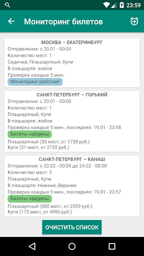 Приложение предназначено для поиска и мониторинга билетов РЖД. Гибкие фильтры мониторинга дают шанс узнать о появлении в продаже нужных мест.