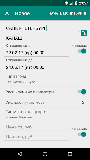 - Если указать только начальное значение интервала отправления, мониторинг будет искать билеты по указанной дате до полуночи. Если указать начальное и конечное значение, мониторинг будет искать билеты во всем интервале дат по порядку;