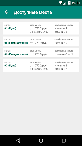 - В результатах будет представлена краткая сводка по наличию свободных мест, сгруппированных по типу вагона, и список поездов, в которых есть свободные