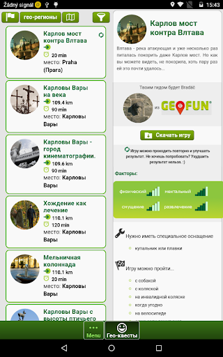 GEOFUN - это продуманное мобильное приложение для смартфонов с операционной системой Android и iOS, которое в забавной форме состязания знакомит посетителей с интересными местами в регионе. По сути это геолокационная забавная игра нового поколения, в которой недостаточно найти место и "отметиться", но необходимо также выполнять разные задачи, которые Тебе сообщит гид в ходе игры. Твоим гидом всегда будет кто-нибудь из местных, кто хорошо знает данный город или область и может дать Тебе дельный совет.