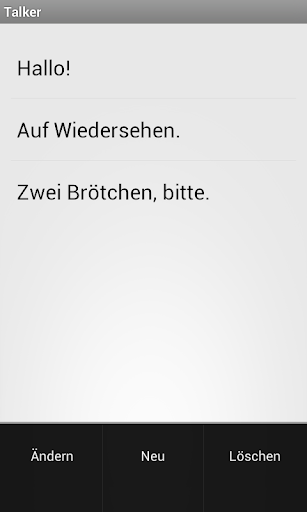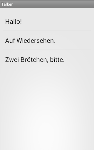 Talker is an app to help people with speech handicaps to store sentences and let the mobile phone speak.A special edit mode makes the accidental modification harder, what makes the app more usable by speech handicapped children. The sentences are ordered by usage, what means that often used sentences appear on the top.