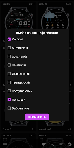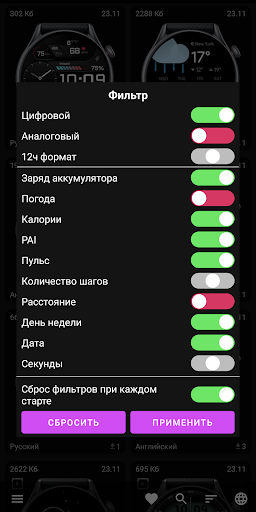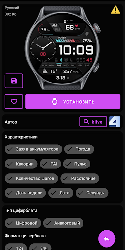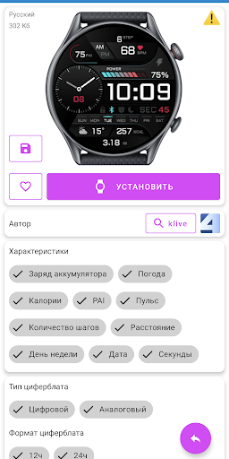 Можно купить подписку и убрать рекламу в приложении🚫 Можно отправить понравившийся циферблат в Избранное, нажав на сердечко рядом с этим циферблатом, а далее посмотреть его нажав на сердечко в нижнем меню🤍 Можно посмотреть Топ 50 установленных циферблатов - за неделю, за месяц и за всё время🔝Так же можно отфильтровать циферблаты по необходимым параметрам, которые вы хотите, чтобы отображались на циферблате🔍 Можно отсортировать циферблаты по дате добавления или по количеству установок 📶 А ещё можно выбрать язык циферблата 🌐 И последнее. Под значком трёх полос в левом нижнем углу есть немного дополнительных функций, которые могут вам пригодится, поэтому загляните ☺️