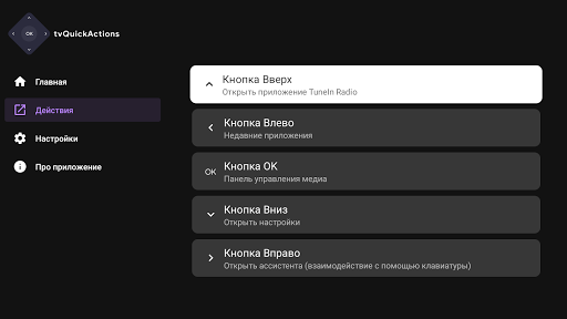 tvQuickActions позволяет назначить 5 действий на одну кнопку пульта ДУ. Это делает использование ТВ-бокса более удобным.