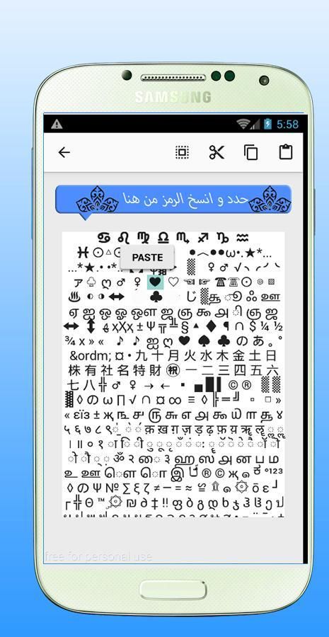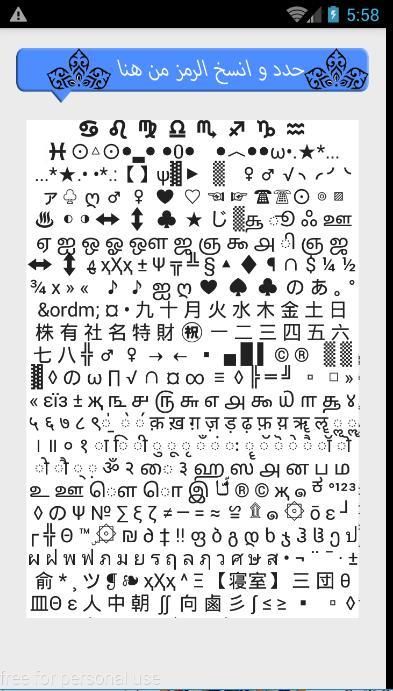 * رموز واشكال: واجهة خاصة بالرموز والاشكال بامكانك نسخ الشكل او الرمز التي تريده وارسالة للشخص المناسب او مشاركته على الفيسببوك والاحباب